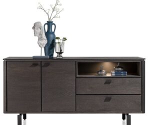 Robuste avec une allure vintage. Ce buffet de la collection Avalon de Henders & Hazel a un aspect remarquable. Le buffet est fabriqué en Primo Laminato, un matériau solide qui est presque indiscernable du vrai bois et est fini dans la couleur driftwood. Les accents en métal noir donnent à ce buffet un look robuste. Le buffet mesure 200 cm de large, possède 4 portes, 1 tiroir et 1 porte vitrée derrière laquelle brille une lumière LED intégrée et chaleureuse.