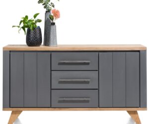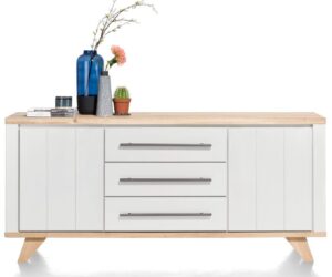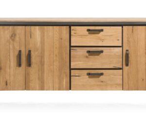 Ce buffet de la collection Avalon a un aspect robuste et quelque peu usé. Ceci est principalement dû à la finition en bois flotté. Les accents en métal noir donnent à ce buffet une touche finale robuste. Le stratifié ressemble à du bois massif, mais il est fabriqué en Primo Laminato, un matériau résistant à l’aspect du bois. La largeur de ce buffet est de 170 cm. Grâce aux 3 portes et au tiroir, l’espace de rangement est amplement suffisant.