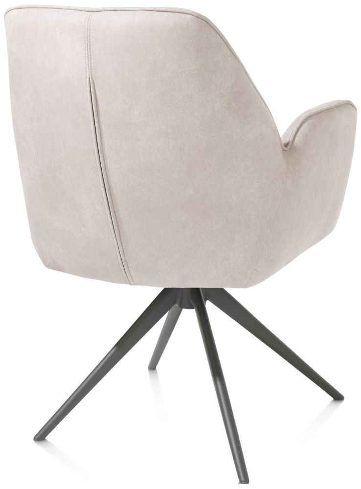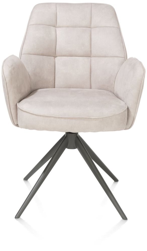 Deze armstoel Bell heeft een uniek design met ruitvormige inpullingen in de rug en een speciaal zitcomfort met pocketvering. Het fijne frame heeft een grafietkleur en is bovendien draaibaar. Deze stoelen zijn bekleed in de fijne microvezelstof Calabria. Er is echter ook een versie die in een combinatie van stof Calabria en stof Vada is uitgevoerd! De stoel is verkrijgbaar in 3 verschillende kleuren – kiezel, mosgroen en olijfkleurig. Dit is de uitvoering in kiezel. Ben je eerder fan van een gewone eetkamerstoel? Die vind je ook in deze collectie!